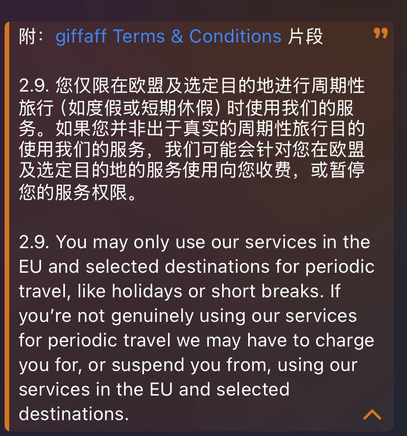 结论很明确:这条,根本就不是写给中国用户看的。关键点在于一个被很多人忽略的前提:giffgaff 把国际漫游用户,分成了两类。第一类,叫**“欧盟及指定地区”**。这一整片区域,在 giffgaff 系统里,统一当成“欧盟区”。英国用户拿着 giffgaff 卡,跑到法国、德国、西班牙这些地方用,资费是和英国本土一模一样的。为什么?因为欧盟曾经有个著名规定——Roam Like At Home(在欧盟漫游,像在家一样)。简单说就是:不准收漫游费。
